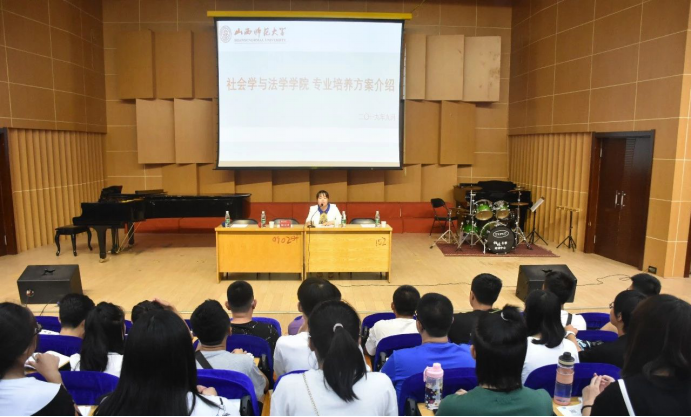 首先,韩老师指出法学和社会学作为社会实践性和服务性都特别强的人文社会科学学科,社会人才缺口大,就业前景十分广阔。之后,她从学院专业设置入手,详细介绍了各阶段的学分要求、课程安排以及期末考评办法等情况,重点强调了关于论文写作和外语考核的达标要求,鼓励学生们要分秒必争,早做规划,做一个有理想,有抱负的人。