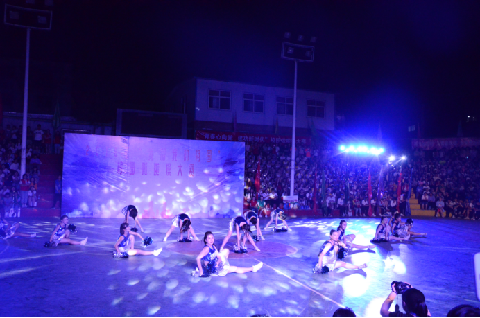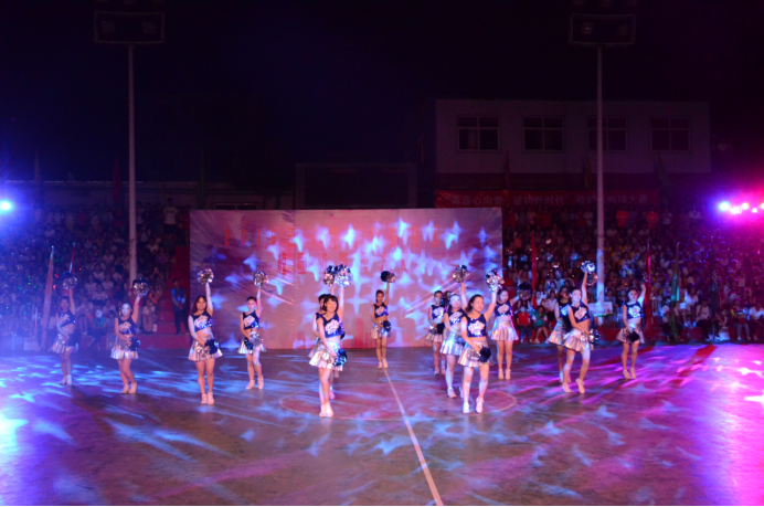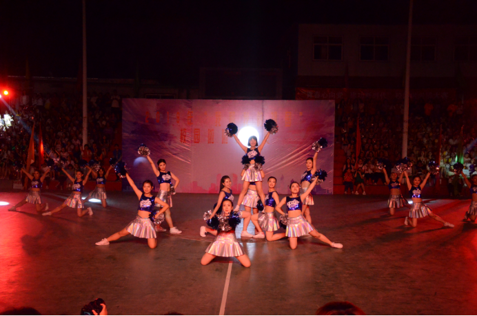 啦啦操代表队积极参加在灯光篮球场举行的校园啦啦操大赛。