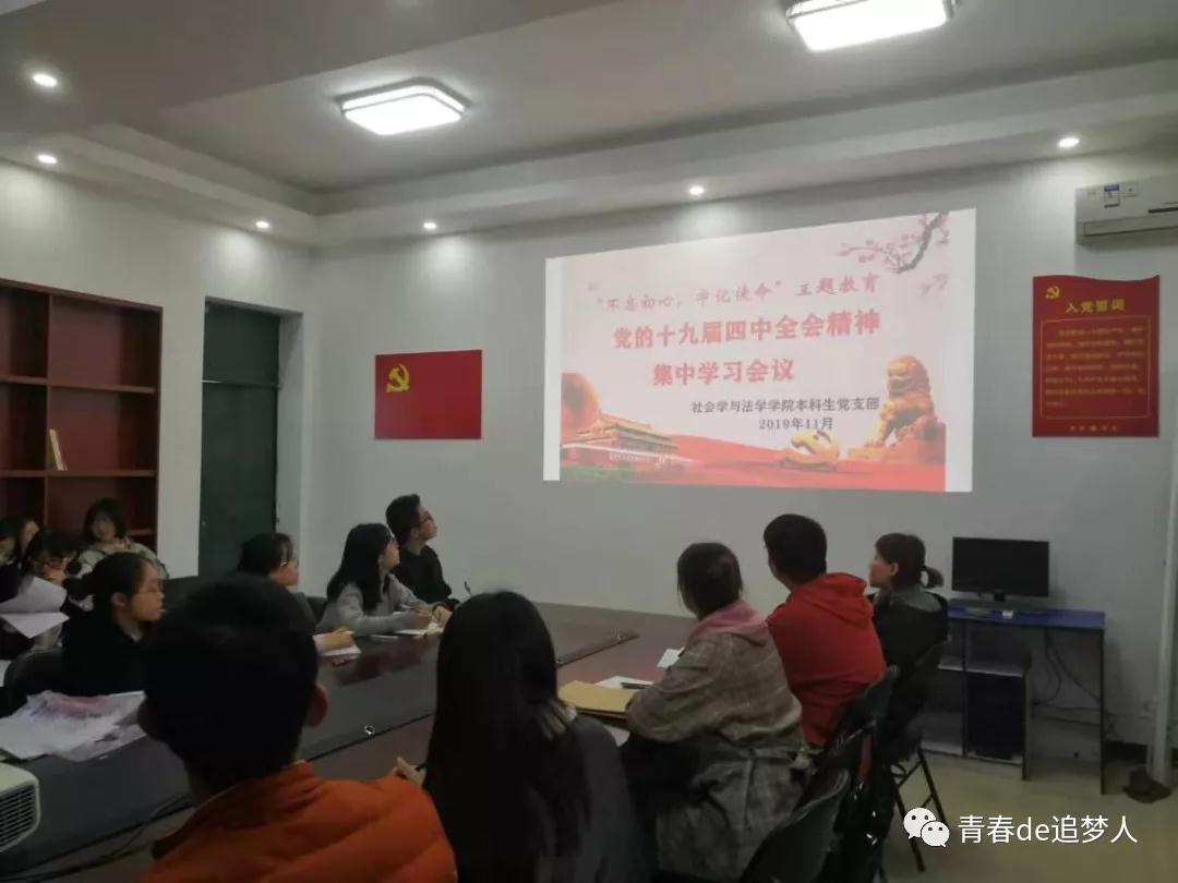 本科生党支部在多功能会议室集体学习党在十九届四中全会审议通过的《中共中央关于坚持和完善中国特色社会主义制度、推进国家治理体系和治理能力现代化若干重大问题的决定》(以下简称《决定》),会议由本科生党支部书记郝兴雅老师主持,全体党支部成员参加。