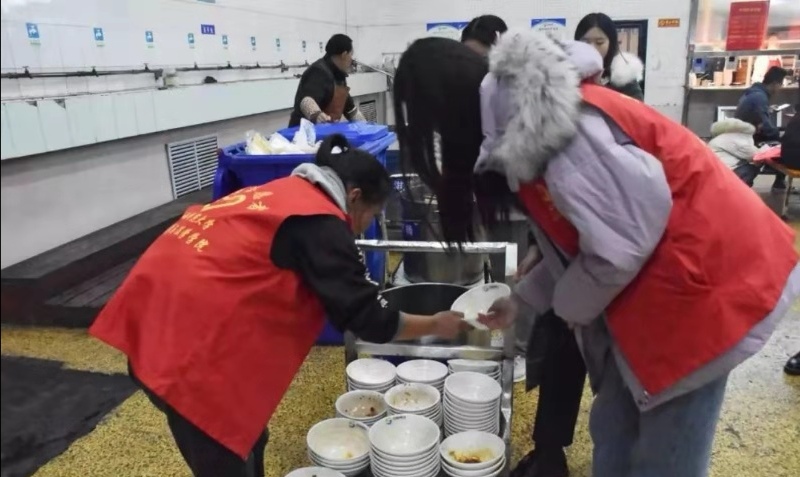 首先,志愿者们携带清扫工具在餐厅门口有序集合并进行分工。活动过程中,一部分志愿者帮助工作人员清扫餐后垃圾并进行分类处理,将剩饭剩菜统一倒入指定回收处,将废纸、空瓶子放入垃圾桶。与此同时,两名志愿者一左一右站在餐具放置处旁,帮阿姨们摆放餐具,努力为同学们打造一个舒适整洁的用餐环境。志愿者们积极工作,相互配合,得到了食堂工作人员的夸奖与认可。活动最后,志愿者与工作人员合影留念,志愿清扫活动圆满结束。