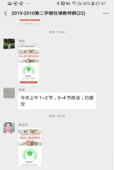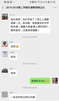 任课教师积极探索各种线上教学方式,按照学院领导审核通过的教学方案,采用腾讯会议、千卿、钉钉等互联网通信软件,充分利用我校网络教学平台、中国大学MOOC、爱课程等平台优质在线课程资源辅助教学,创建班级“停课不停学”微信群、QQ群等,在线发布思考题,积极主动和学生对接,实时掌握学生学习动态。学生积极与任课教师进行线上互动和交流,按时完成了学习任务。