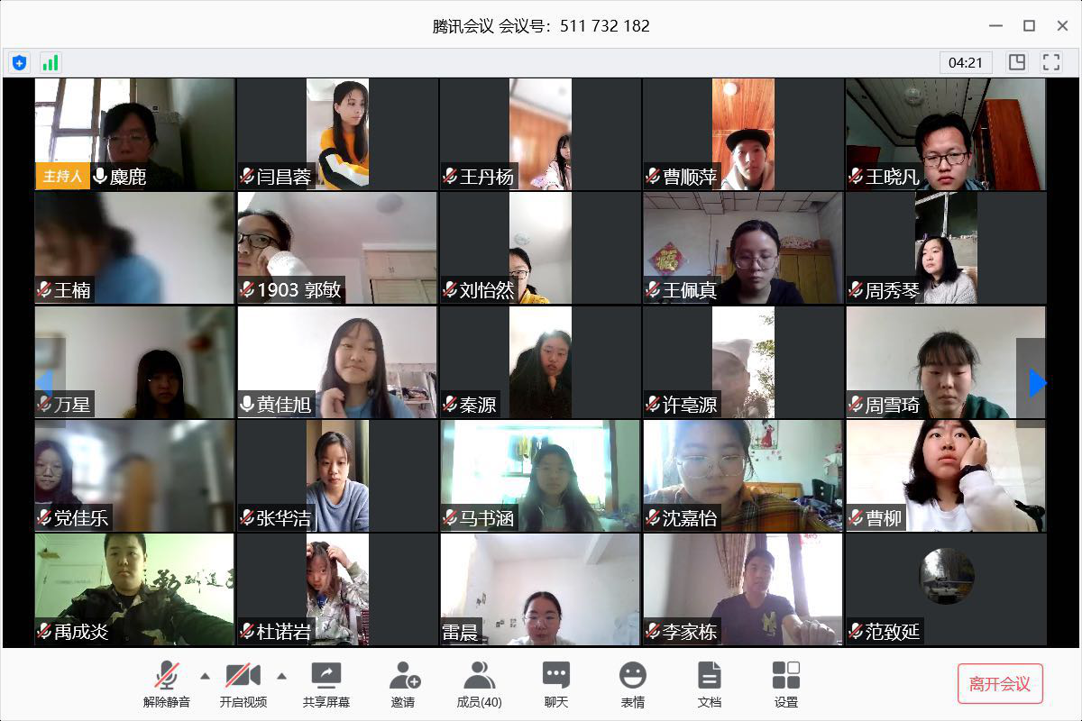 1903班通过腾讯会议APP召开了线上主题班会。此次班会由辅导员老师于宝钗主持,1903班全体同学参加。