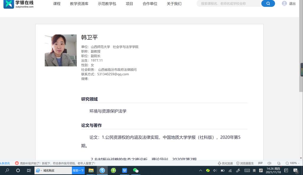 一直以来,韩卫平老师在教学工作中兢兢业业,不断提升专业水平,持续推进教学改革,承担了《环境资源保护法学》《环境社会学》等专业课程的教学任务。为了发挥法学专业的先天育人功能,提高学生的法学素养,她突破专业限制,积极进行法学通识课建设,面向全校学生开设了通识课程《大学生活与法律》,该课程的开设为完善我校课程体系,提高课程育人效果发挥了积极作用。该课程被认定为2018年校级优质课程。