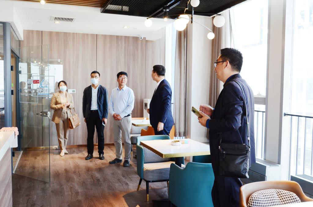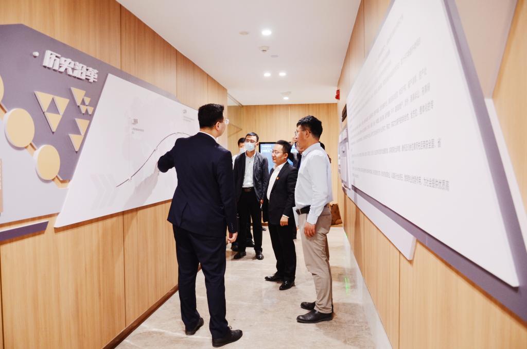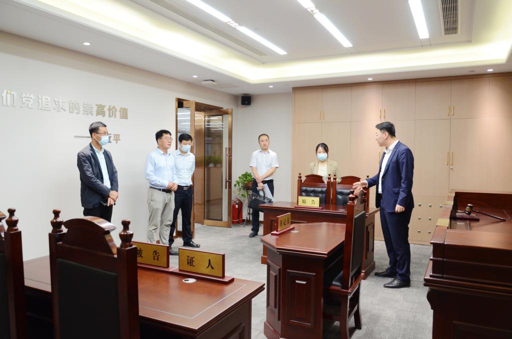 老师参观了国晋律师事务所的党建活动室、法学院、档案室、模拟法庭、文化建设墙、智能预约接待室等办公场所。郭宏伟主任介绍了国晋律师事务所的历史发展沿革、管理体系、业务发展方向等情况。王莹党总支书记重点介绍了具有国晋特色的“五统领”党建工作方法。