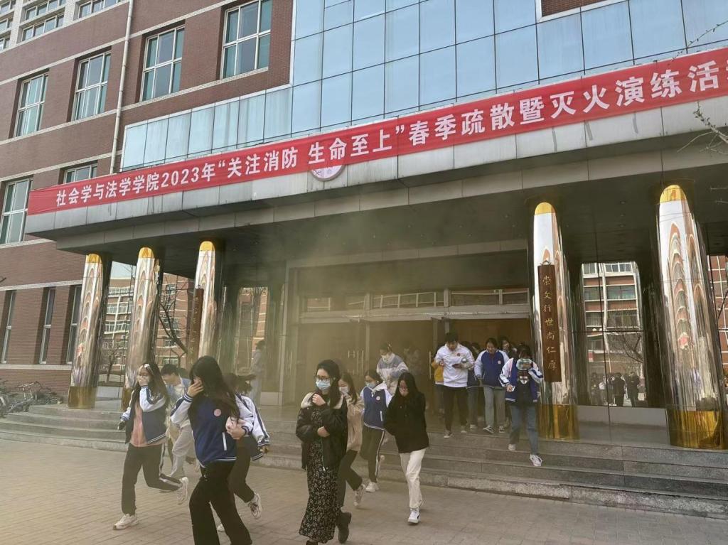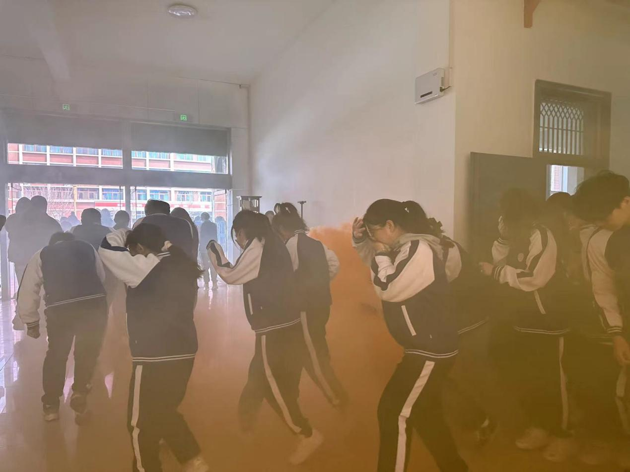 全院学生进行了两次消防疏散演练。象征着火情的哨声响起,同学们按照预先确定好的逃生路线,用湿毛巾捂住口鼻,低下身子迅速有序地从教学楼中撤离,到达集合场地,负责人清点本班人数,并向现场指挥报告。两次疏散过程用时短、有秩序,达到了预期效果。