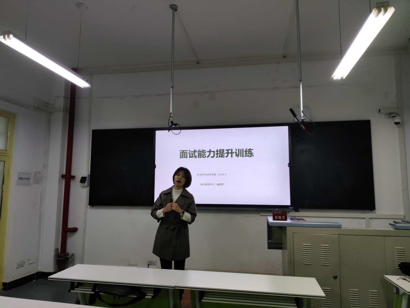 邀请学工部就业指导中心崔晓芳老师在信息楼105教室作专题培训。专职辅导员付含培、专职组织员武震雄及全体在校毕业生参会。