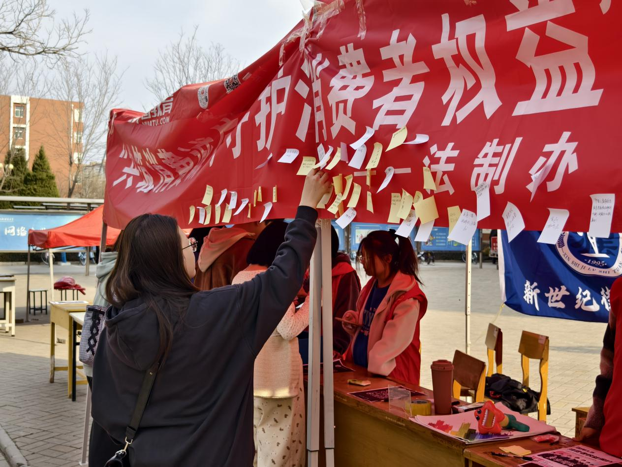 新世纪律师团在思政文化街6号教学楼前举办“共筑消费诚信,守护消费者权益”315活动。本次活动除大一大二学生志愿者参与组织之外,还特别邀请了职业律师,提高了广大师生的活动积极性。