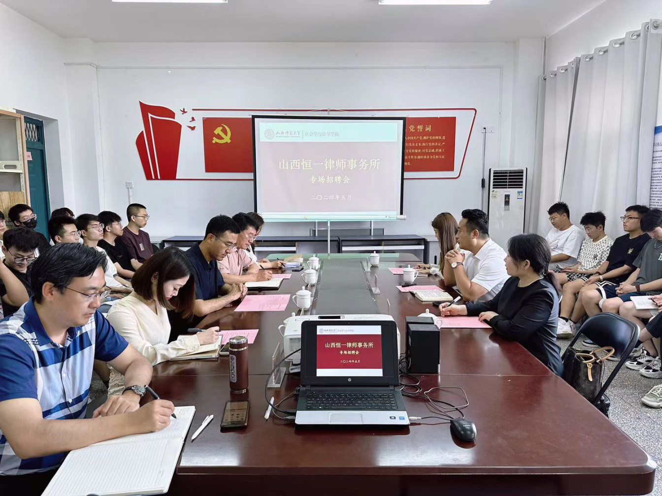 在1号教学楼三层多功能会议室举办山西恒一律师事务所专场招聘会。学院领导出席会议,毕业班辅导员、恒一律所代表及三十余名毕业生参加会议。