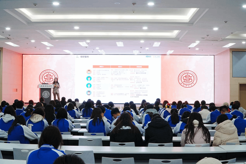 袁老师以“在时代浪潮中锚定青春航向”为主题,通过亲身经历,强调专业能力与理想信念并重,引导学生将个人成长融入国家发展。针对升学与就业问题,袁小清老师进行了重点讲解。她系统梳理了考研备考时间线,给出相对应的备考建议,并详细讲解简历优化技巧。此外,她还结合图标呈现了公务员、事业编、人才引进的报考条件、岗位特点及发展路径,并整理关键的考公时间节点,为有相关规划的同学提供了清晰的行动参考。