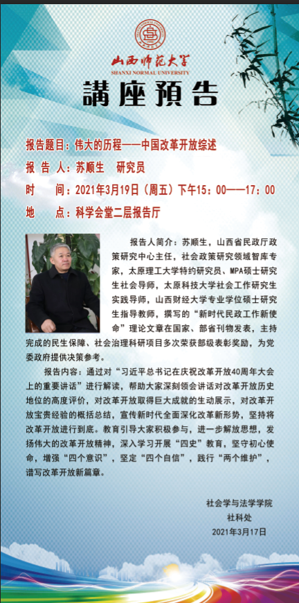 苏顺生,山西省民政厅政策研究中心主任,社会政策研究领域智库专家,太原理工大学特约研究员、MPA硕士研究生社会导师,太原科技大学社会工作研究生实践导师,山西财经大学专业学位硕士研究生指导教师,撰写的“新时代民政工作新使命”理论文章在国家、部省刊物发表,主持完成的民生保障、社会治理科研项目多次荣获部级表彰奖励,为党委政府提供决策参考。
