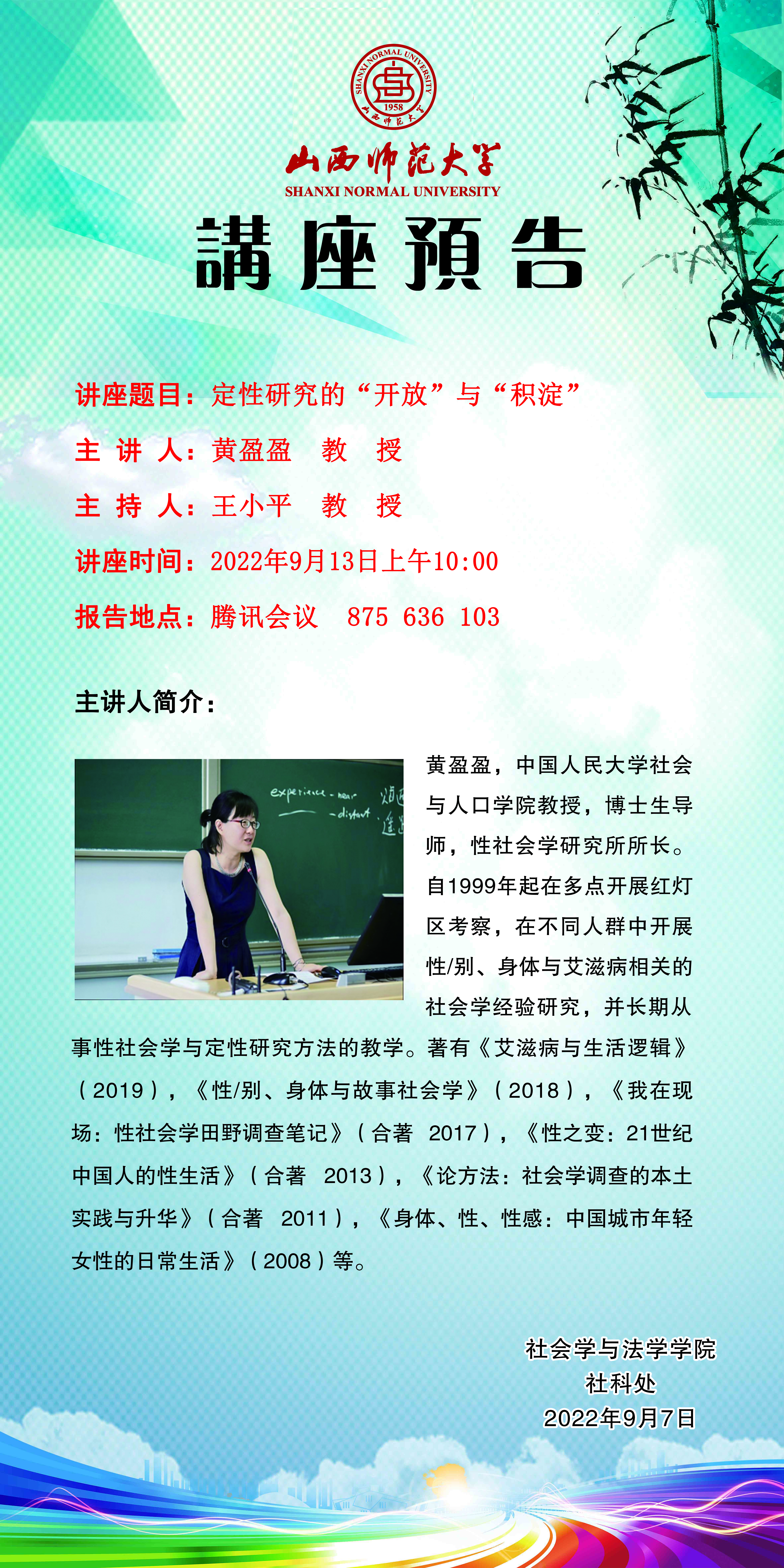 黄盈盈,中国人民大学社会与人口学院教授,博士生导师,性社会学研究所所长。自1999年起在多点开展红灯区考察,在不同人群中开展性/别、身体与艾滋病相关的社会学经验研究,并长期从事性社会学与定性研究方法的教学。著有《艾滋病与生活逻辑》(2019),《性/别、身体与故事社会学》(2018),《我在现场:性社会学田野调查笔记》(合著2017),《性之变:21世纪中国人的性生活》(合著2013),《论方法:社会学调查的本土实践与升华》(合著2011),《身体、性、性感:中国城市年轻女性的日常生活》(2008)等。