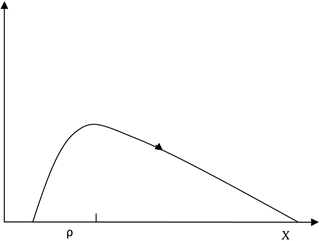 阿克洛夫在《动物精神》里曾谈到传染病的传染方式与“故事”的传播方式的类似性,认为可用传染病模型来研究“故事”的传播(阿克洛夫、席勒,2016:83)。事实上,传染病模型也是一个研究集体行动的模型。在传染病模型中,患有传染病的人数、易感染人数和曾被感染(不具备传染能力的个体)是关注重点。而感染率与免疫率是关键变量,即易感染者与已感染者接触后感染机会的大小以及感染者死亡或恢复健康或被隔离的机会的大小。因为传染病的传播存在“免灾效应”,最终会因为不再有被感染者而使病毒失去传染源,无法继续传播,所以该系统不会出现单向倾斜至所有人都被感染的结果。如图2 所示,系统轨迹曲线(随箭头所示方向由右向左变化)最后会与X 轴相交,回到初始没有人被感染的状态(郭爱民,2015:25-26)。由此我们认为,由于免疫率的存在,传染病传播与“故事”传播在这方面是存在区别的。