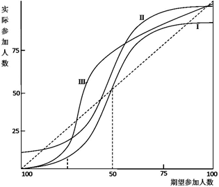 在图1 中,横轴表示期望的参加人数,也就是每个个体的“临界值”,纵轴表示偏好参加的人数,也就是实际有多少人参与。45 度线上的诸点表示实际参加累积人数等于期望参加的累积人数;其左侧部分曲线, 表示实际参加人数大于期望参加人数,右侧部分曲线则表示实际参加人数小于期望参加人数。只有当实际参与累积人数大于期望参与累积人数时,即累积曲线处于45 度线左侧时,集体行动才能自动延续。